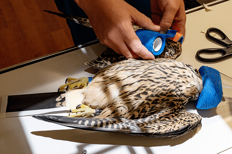 After that, “all raptor patients need to get into athletic condition,” she said. “Most species, like owls and red-tailed hawks, are put in an aviary and allowed to fly. But falcons are not safe there because of their speed. So they work with falconers … ” to move beyond their injuries and build muscle mass, fly again in the open sky and hunt.