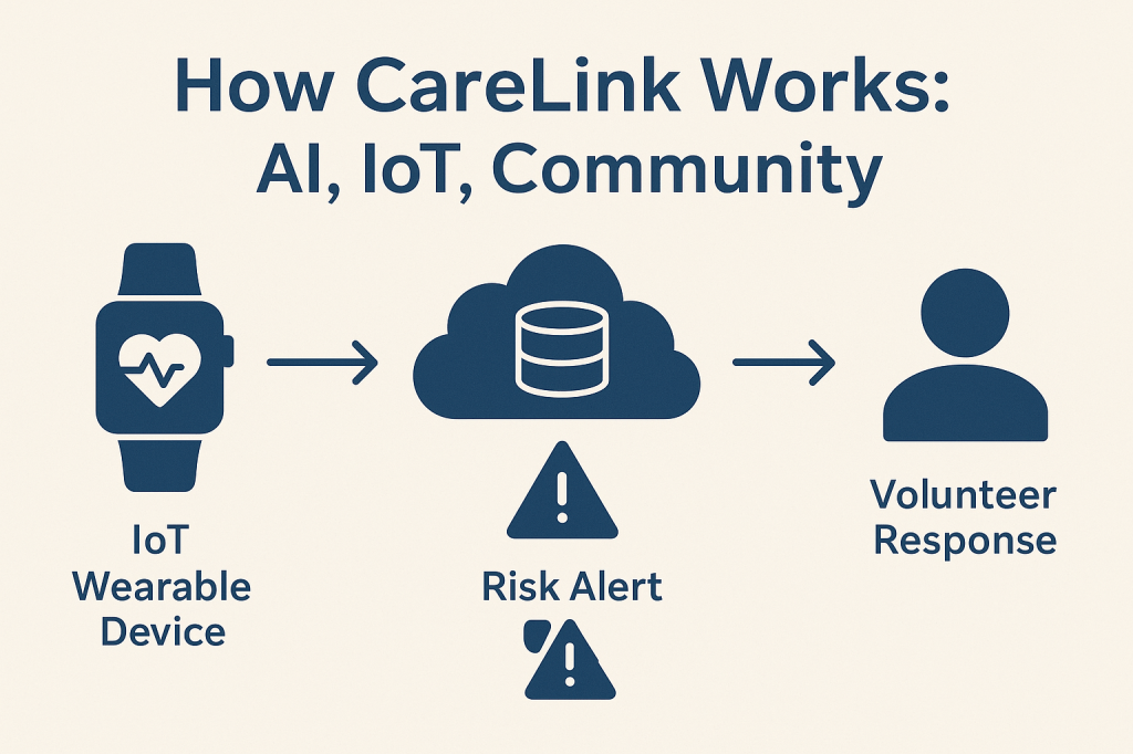 CareLink devices collect real-time biometric data (e.g., heart rate, blood pressure) and transmit it securely to a cloud platform for continuous monitoring. - AI Risk Prediction & Emergency Response